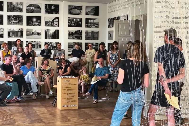 Der Ausstellungsrundgang startet im Schloss Altranft, einem Herrenhaus inmitten eines Landschaftsparks aus dem 19. Jahrhundert. Die besondere Topografie des Oderbruchs zeigt Künstlerin Antje Scholz mit ihrem Gespinst, das die Wasserführung der Oder sowie das komplexe Grabensystem darstellt. Mit einer großen Murmelbahn lassen sich die Fließwege des Wassers spielerisch erkunden. In Fotografien von Menschen aus dem Oderbruch, Filmen und Audiostationen steht die Landschaft selbst im Mittelpunkt.